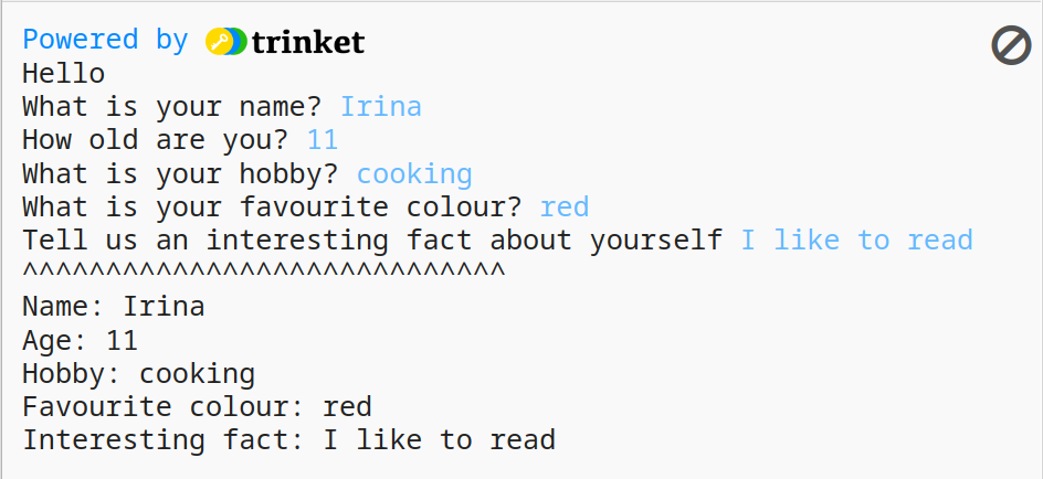 IMPORTANT!: It's important to understand that Trinket creates public web pages and projects that anyone with a link can view. Young people may need a reminder about the importance of not sharing personal information online.