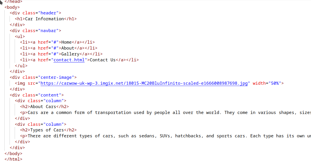<div class="content"> <div class="container"> <div class="row"> <div class="col-md-6"> <h2>About Cars</h2> <p>Cars are a common form of transportation used by people all over the world.</p> </div> <div class="col-md-6"> <h2>Types of Cars</h2> <p>There are different types of cars, such as sedans, SUVs,hatchbacks, and sports cars.</p> </div> </div> </div> </div>