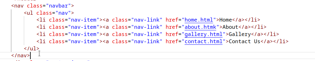 Let's add a top menu section to the page using a div container and list ul with list items li>. Here are the steps: