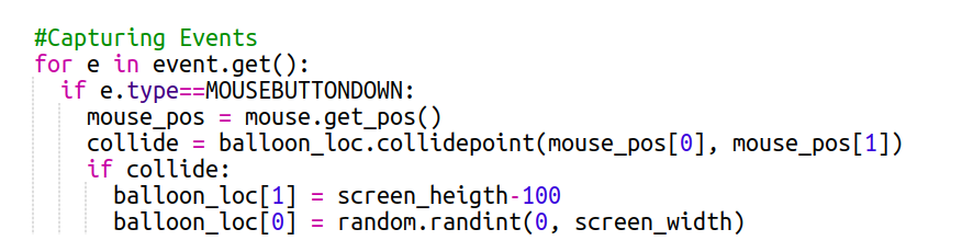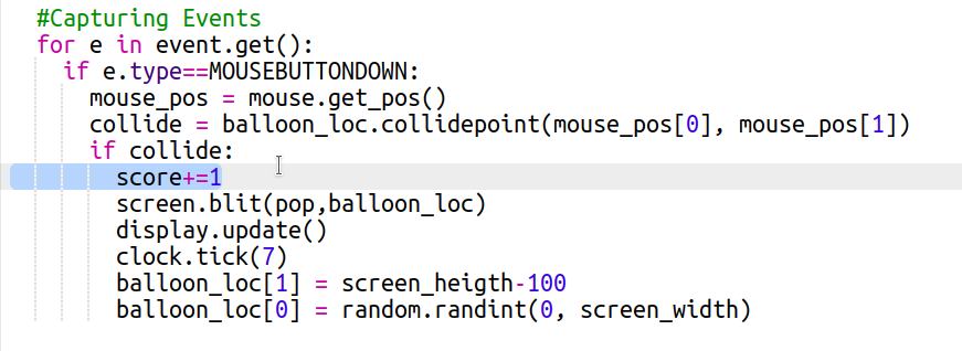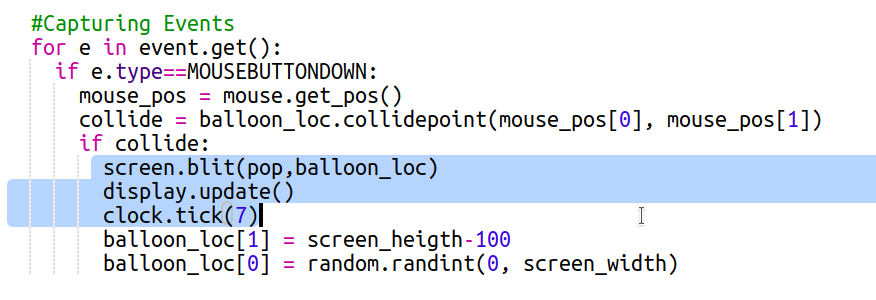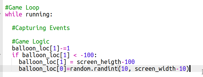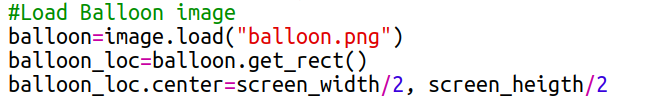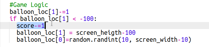 This piece of code will make balloon appear again after it reaches the top of the screen. We also used random.randint() function to make balloon appear on the different location. Don’t forget to import random function at the top of the code like this: