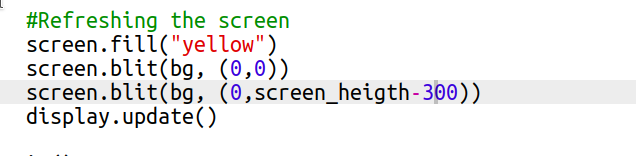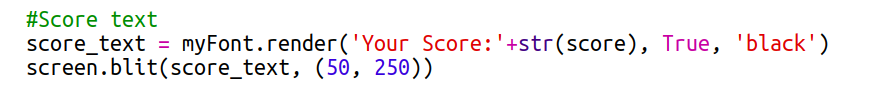 Next, display the score as a text on the screen, for this we use the following lines of code First, define the font at the top of the program before the main loop: