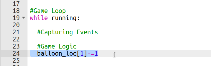 To make an object move in Pygame we need to change it’s x or y coordinates. For balloon to fly we will be changing y coordinate. This code line should be added to the main loop under the Game Logic