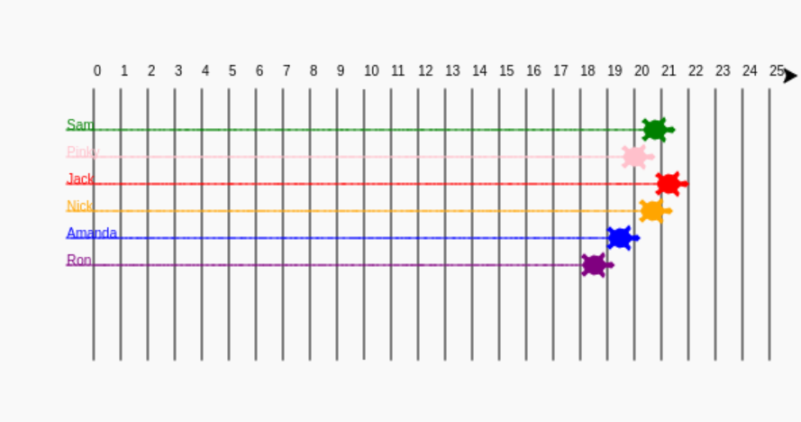 To start the race we will create a for loop where we line up all the racers. All the racers will need to move forward, so we will pick the random number of pixels each racser can move forward using randint command.