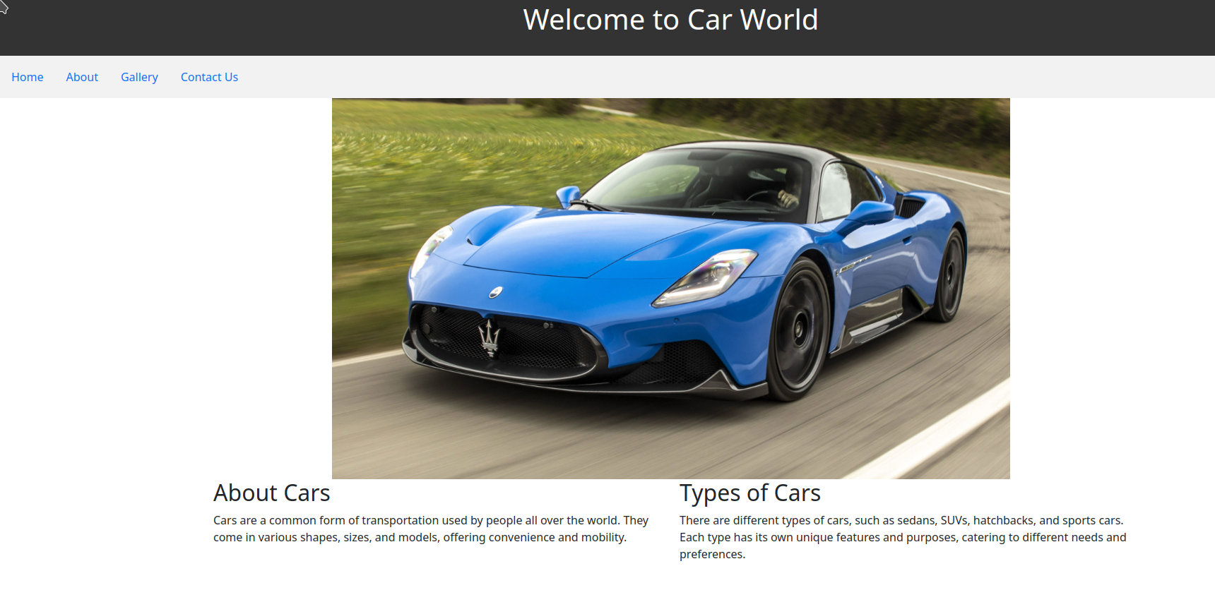<div class="content"> <div class="container"> <div class="row"> <div class="col-md-6"> <h2>About Cars</h2> <p>Cars are a common form of transportation used by people all over the world.</p> </div> <div class="col-md-6"> <h2>Types of Cars</h2> <p>There are different types of cars, such as sedans, SUVs,hatchbacks, and sports cars.</p> </div> </div> </div> </div>
